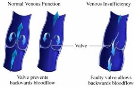 retrograde (“backward”) venous flow (reflux), or a combination of these. The deficient valves in the veins in CVI fail to prevent the retrograde flow of venous blood during muscle pump activity, specifically the activity of the calf musculature during walking (ambulatory). Muscle activity in the legs applies outside pressure to the veins and a functioning system of valves forces the venous blood upward and towards the heart while walking and prevents backflow. In CVI the blood is not only forced upward towards the heart during muscle activity, but also “backwards” causing the pressure in the veins of the lower leg to increase even more (ambulatory venous hypertension).